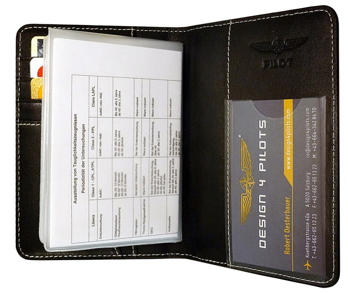 Uvnitř je šest plastových kapes na pilotní průkaz, zdravotní a jiné průkazy. Dále tři kapsy na kreditní karty, jedna na vizitku, druhá na papír a vyražené logo PILOT®.