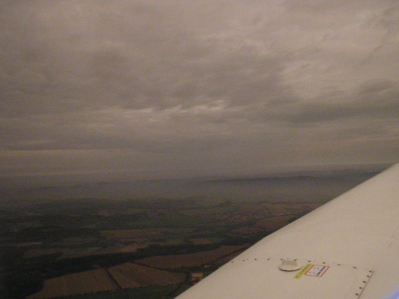 Po vzletu z dráhy 11 se s námi karlovarský řídící po oznámení o ukončení provozních hodin letiště ještě rozloučil. Netrvalo ani 5 minut a dohlednost se rapidně zhoršila. Z předcházejícího meteobriefingu jsme věděli, že směrem na jih má být dohlednost lepší. Z přímého odletu na Rakovník bylo najednou esíčko směrem na Toužim. Ale lepší to nebylo. Kouřmo na zemi přecházelo plynule do souvislé oblačnosti již v nějakých 3 000 ft. Naše změna směru na Toužim optimální nebyla, vždyť jen malý kousek od Toužimi číhá vysílač Krašov, jehož vrchol ve 3463 AMSL není nic, co bychom rádi potkali. Rozhodnutí o návratu bylo na světě.