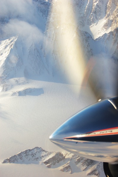 Pokud by Nobileho vzducholoď musela přistát, její posádka by byla nucena přežít na zásobách pemikanu, suchého mléka a sucharů. My se naštěstí takových obtíží snad obávat nemusíme. S Heinzem Finkenzellerem z Institutu jsme se potkali jen chvilku poté, co se naše pětilisté vrtule Hartzell zastavily.