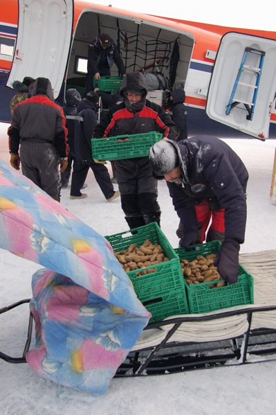 Vědci se okamžitě shromáždili kolem nákladových dveří, připraveni udělat vše pro to, aby vyložili a přemístili drahocennou zeleninu dřív, než z ní mráz udělá bezcenné barevné šutry. Z reje kožešinových čepic a šál se vynořil Jürgen Graeser, hlavní důvod naší cesty. Po krátkém uvítání se okamžitě pustil do dohledu nad nakládáním svých cenných aparatur v hliníkových krabicích a dřevěných bednách, které začaly plnit útroby Basleru. Vše bylo naloženo, ale banda přátelských polárníků, tolik toužících po lidské společnosti, nás zve k prohlídce tábora, zahrnujícího boudy, palivové nádrže a několik na ledu ležících člunů. Pokud by snad oceánské proudy rozervaly kru, byly by tyto malé lodě jediným prostředkem k záchraně.