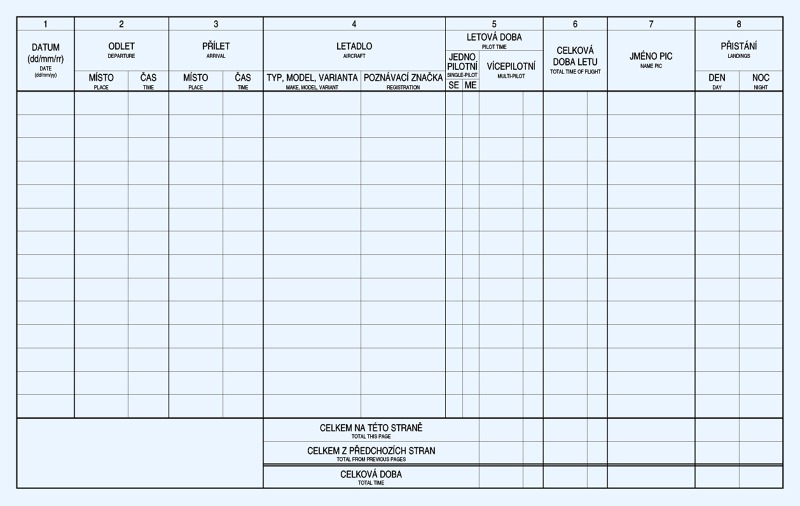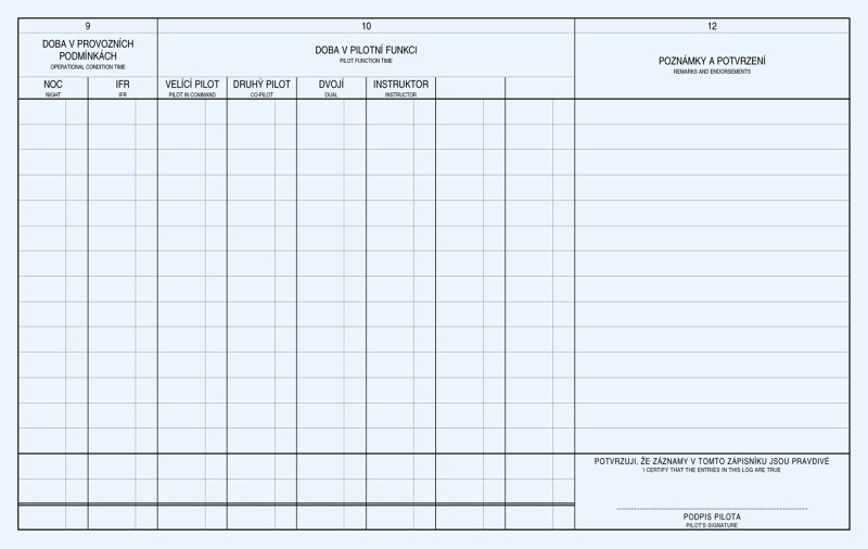 Zápisník pro piloty motorových letadel/vrtulníků je vázaný v modré vysoce kvalitní kožence. Zápisník letů pro vedení letové dokumentace dle JAR-FCL.Odpovídá předpisu PartFCL Annex 2011/016/R. Kromě listů pro záznamy jednotlivých letů obsahuje úvodní listy s údaji o jeho držiteli, podrobný návod v českém a anglickém jazyce, oddíl pro záznamy létaných typů a kvalifikací, listy pro záznamy cvičení na letovém výukovém simulátoru, oddíl pro záznamy o praktickém a teoretickém přezkoušení, absolvování kurzů a škol a volné listy na poznámky.