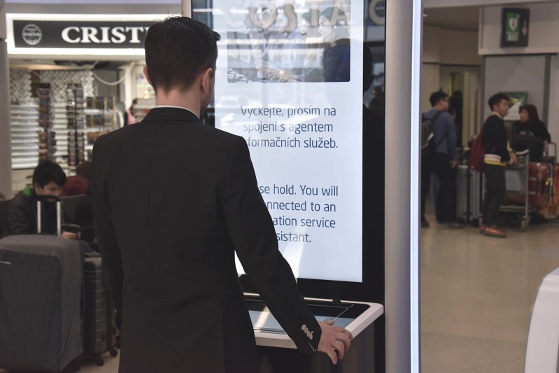 On-line kiosků pro cestující najdete ale v terminálech ruzyňského letiště více. Kromě check-in terminálů, které už cestující mohou využívat delší dobu, zde na přelomu roku uvedli do zkušebního provozu také informační kiosky. Ty vám nabízí možnost videohovoru s pracovníkem informací, ale nemusíte absolvovat nezřídka mnoho desítek metrů k nejbližíš informační přepážce. To může být v situaci, kdy vás začíná tlačit čas, docela příhodné. Virtuální informační služba má podobu kiosku s velkým LCD displejem a funguje na principu videohovoru s živou informační agentkou nebo agentem na vzdáleném pracovišti.