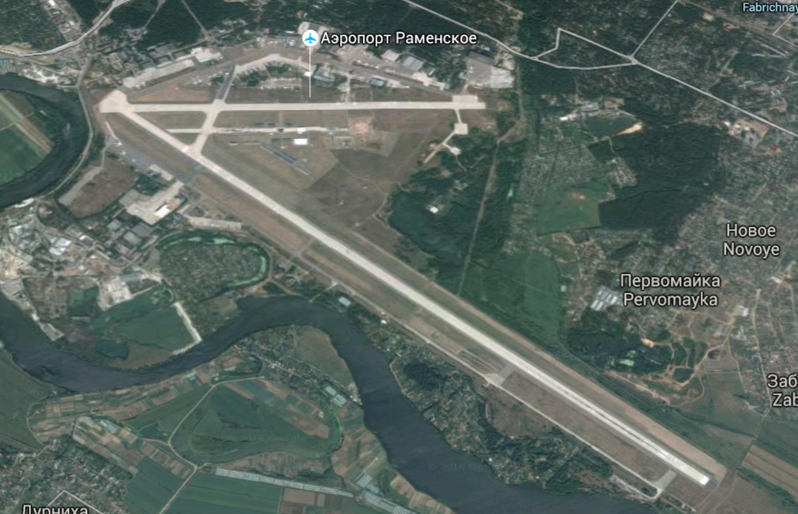 Dosavadní letiště Ramenskoje na mapách Google. Delší dráha je 12/30, kratší 8/26.